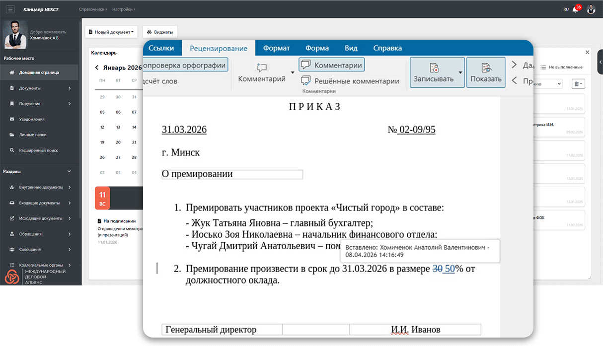 Как это работает. В «Канцлер НЕКСТ» подготовка и согласование документа объединены в единую рабочую среду. Встроенный браузерный редактор, развернутый в закрытом корпоративном контуре, позволяет нескольким сотрудникам работать с одним документом одновременно. Правки отображаются в режиме реального времени, обсуждения ведутся в карточке документа. Система автоматически сохраняет историю версий, карточки связываются перекрестными ссылками. Права доступа настраиваются гибко: на этапе согласования можно ограничить редактирование, оставив участникам только возможность комментировать.