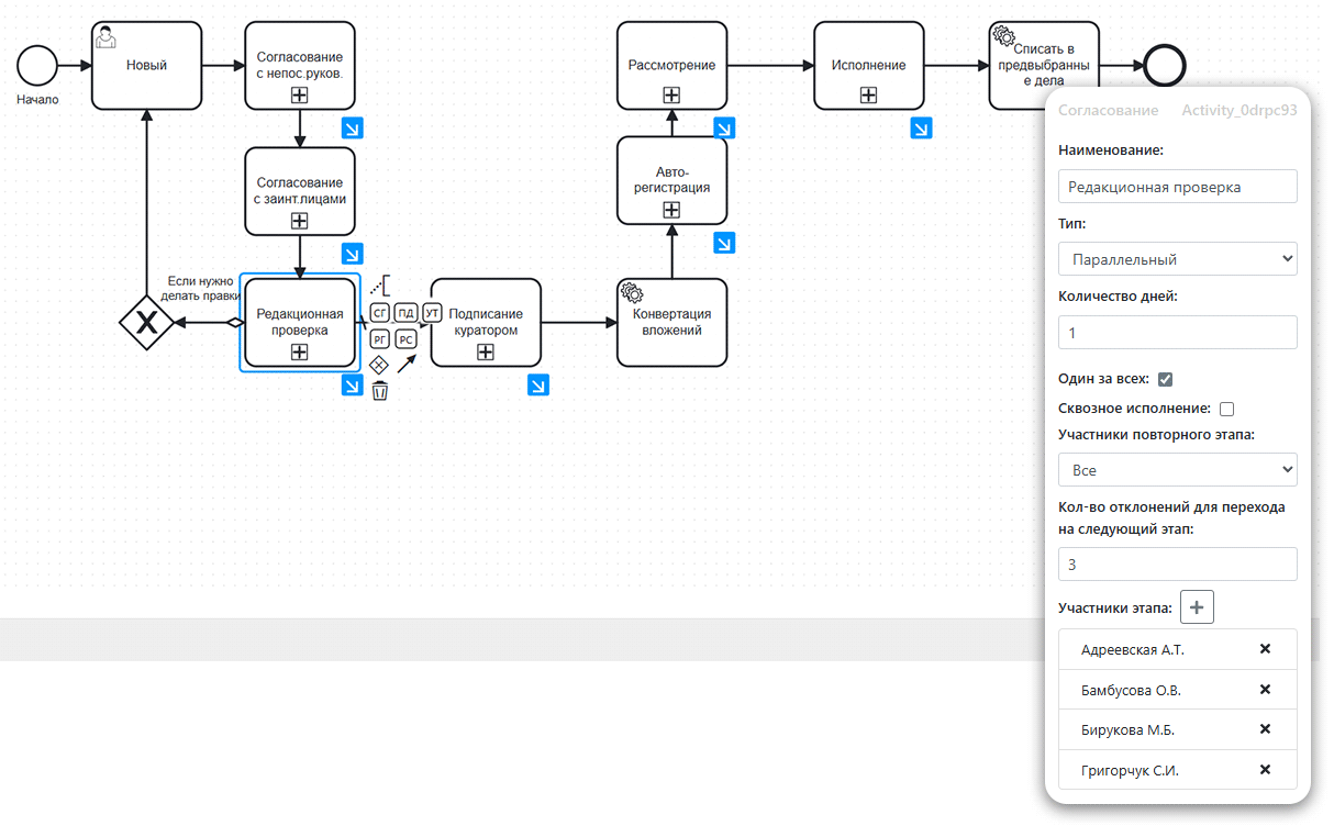 Как это работает. BPMN-редактор встраивает механизмы контроля сроков непосредственно в логику маршрута. Если документ направлен в подразделение с несколькими руководителями, этап закрывается при получении визы любого из них.